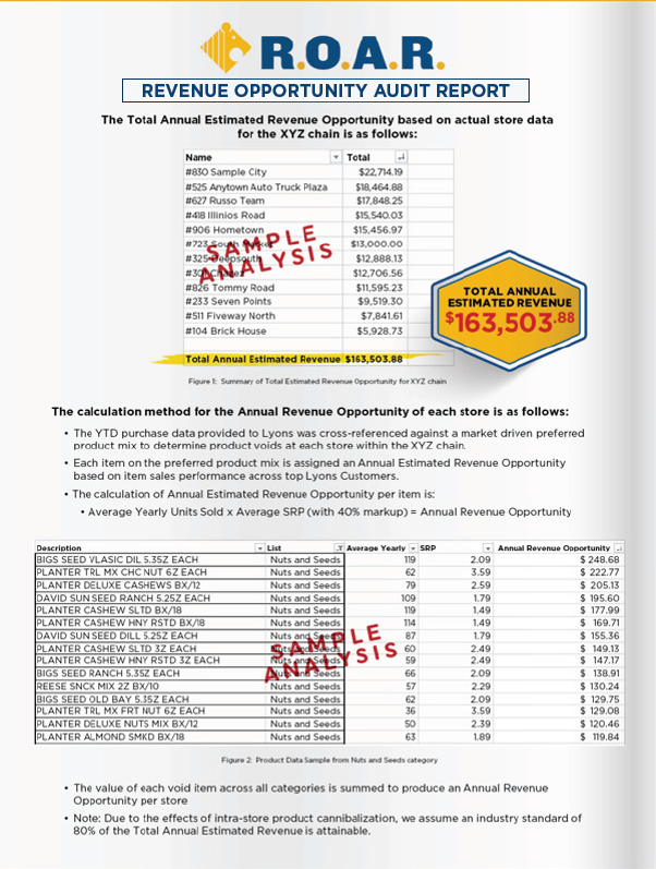 As a Lyons customer, you have the benefit of actually measuring the value of potential opportunities specifically in your store. Our director of data management uses the Revenue Opportunity Audit Report (R.O.A.R.) to analyze your purchase data and compare it to a market driven preferred product mix. The result identifies the products you should be carrying but aren’t and calculates an annual estimated revenue opportunity for each of those missing items. Collectively, the R.O.A.R. offers you actual insight into how much more revenue you could potentially generate on an annual basis.